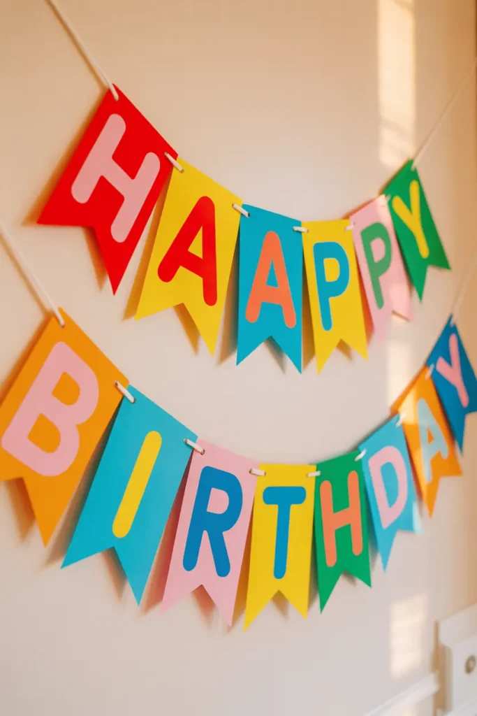 Cut out letters that spell “Happy Birthday” and attach them to a string. Hanging the banner above the table or along the wall creates a cheerful party atmosphere.