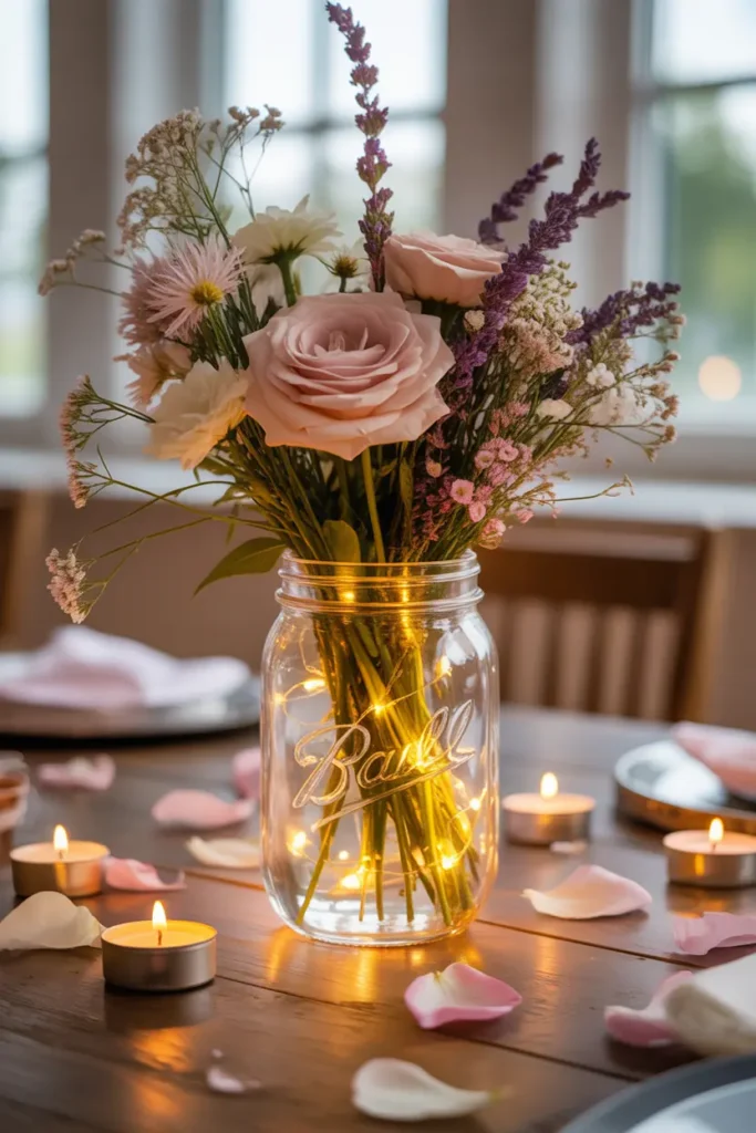 Even a decorated mason jar with fairy lights can create a cozy party atmosphere.