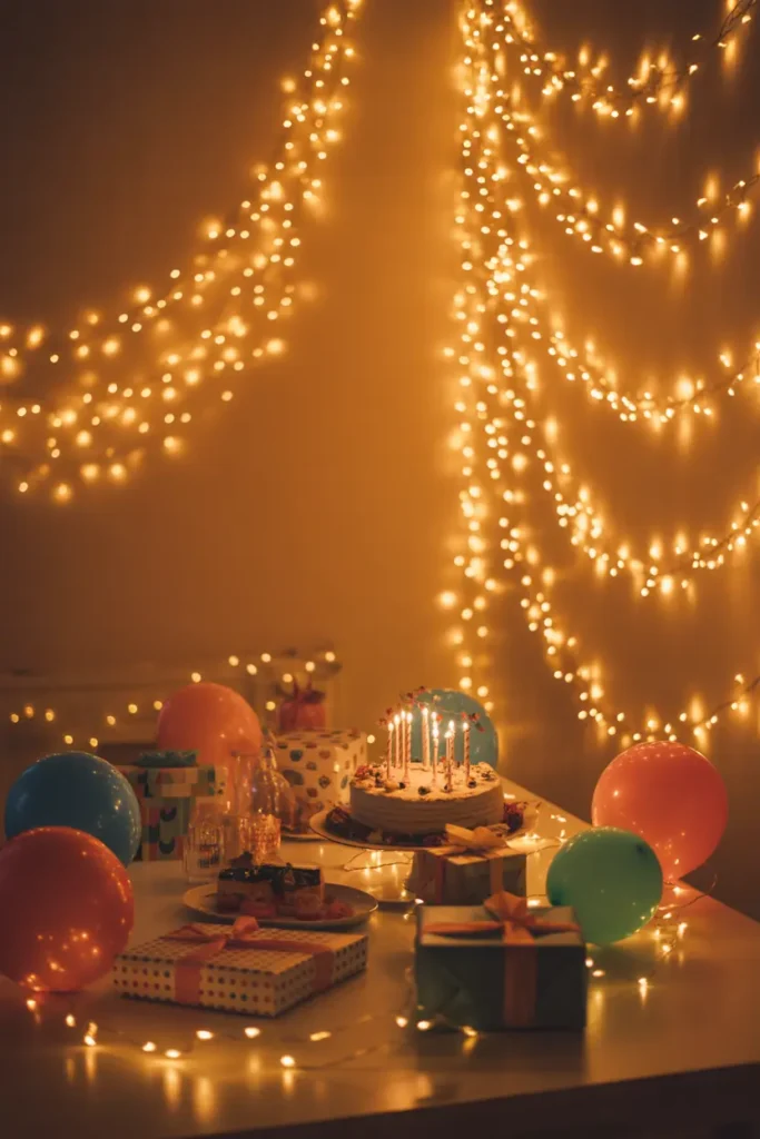 Fairy lights are one of the easiest ways to create a magical birthday atmosphere. You can wrap them around furniture, hang them on walls, or place them inside jars.