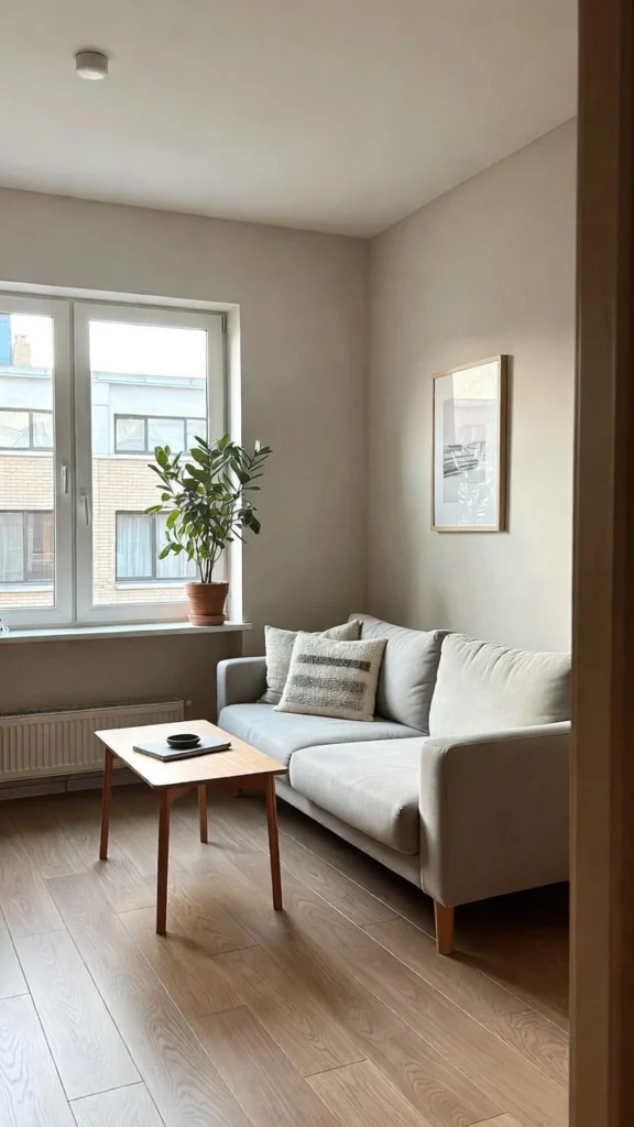 Light colors like white, beige, or soft grey make small apartment living rooms feel bigger and brighter. Neutral tones also allow you to change decor easily later.