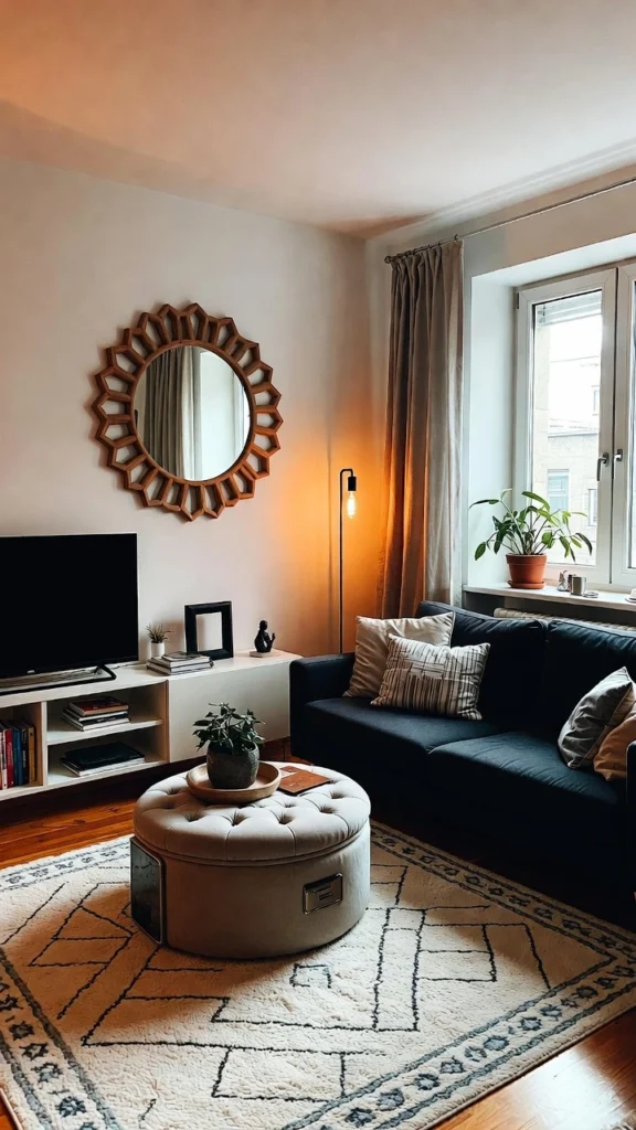 Mirrors reflect light and make small spaces appear larger, making them perfect for apartment living rooms.