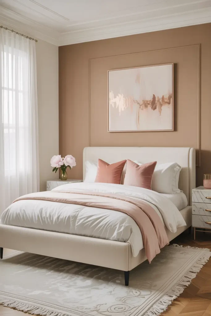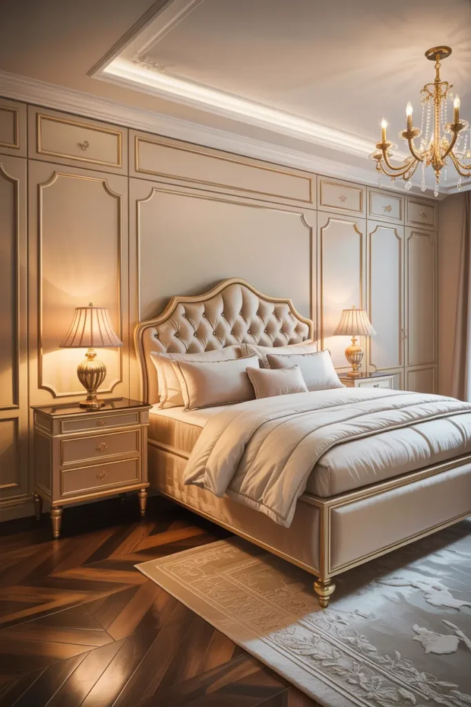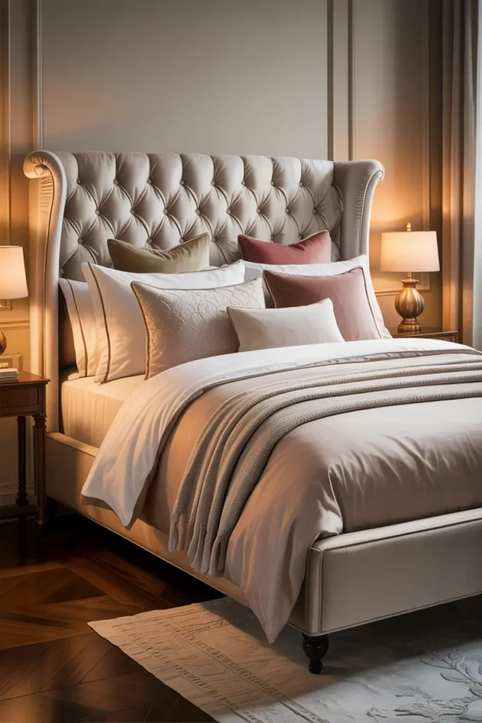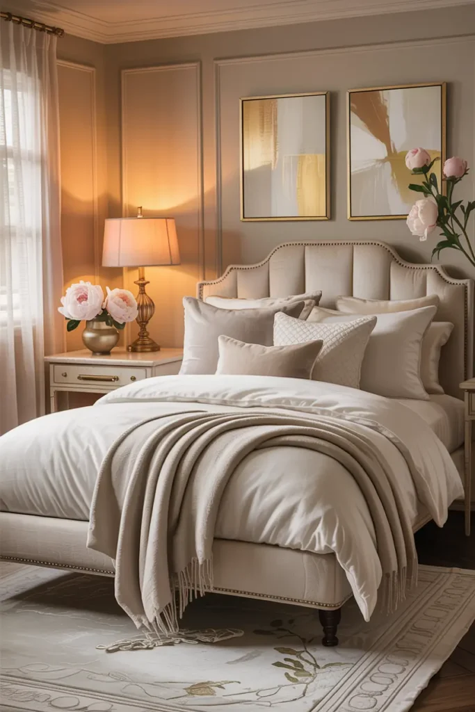 These colors also work beautifully with gold, blush, or soft brown accents. A neutral base allows the bedroom to feel classy without being overpowering or trendy.