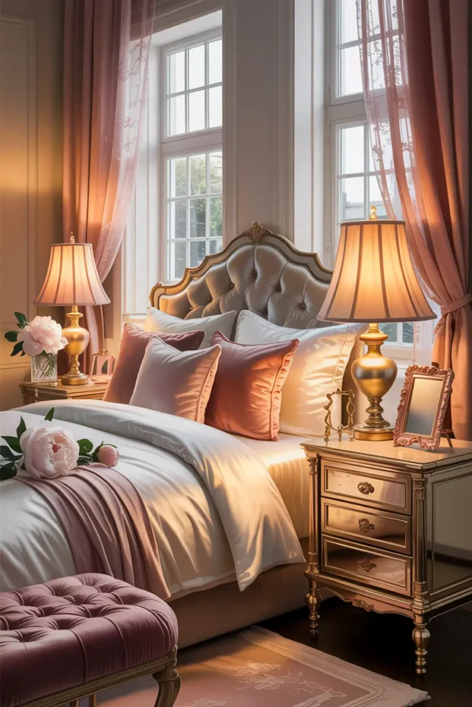 Layered bedding instantly makes a bedroom feel rich and stylish. Soft sheets, plush pillows, and a textured throw give a hotel-like appearance. This creates a cozy yet refined look perfect for a classy women’s bedroom.