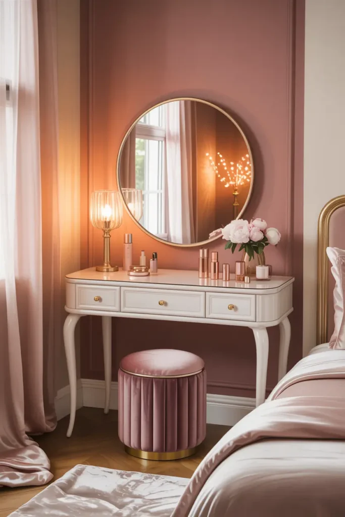 A chic vanity or side table adds elegance and function. It creates a personal space for beauty routines or quiet moments. Clean lines and soft finishes keep it classy.