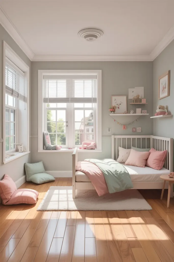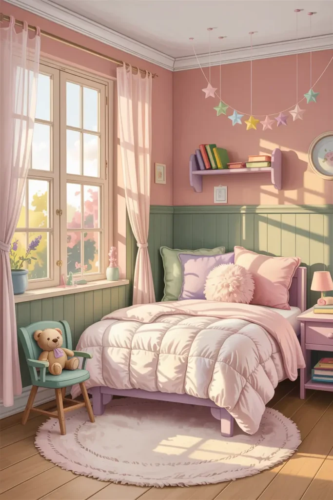 Choose colors that feel calm but cheerful, like pastel blue, soft pink, mint green, or warm beige. These shades keep the room bright without overwhelming the child.
