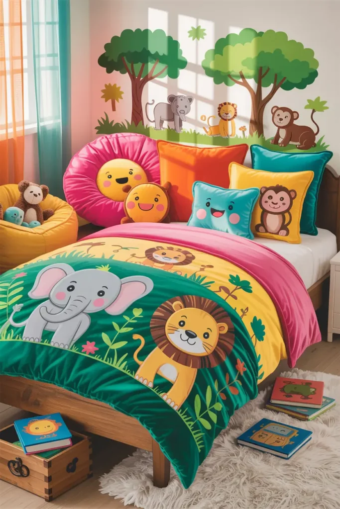 The easiest way to add personality is through bedding. Cartoon prints, animal themes, or star patterns instantly make the bed fun and inviting.
