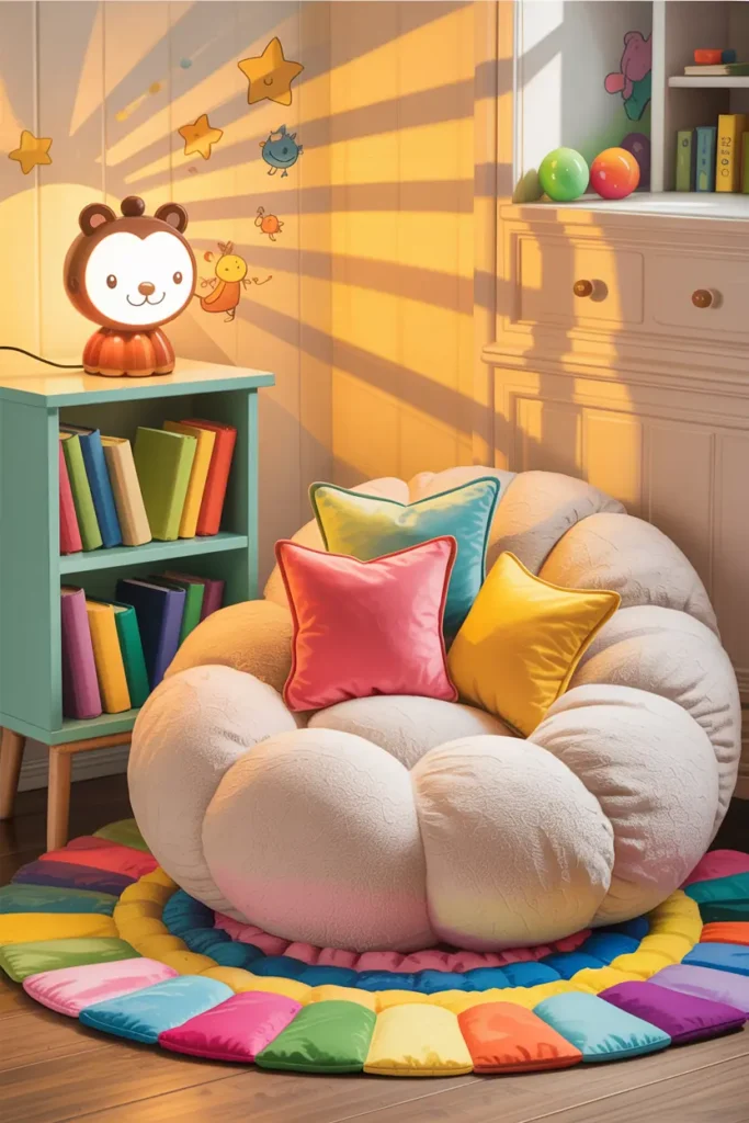 A small reading corner with cushions or a bean bag encourages quiet time and creativity. Add a small shelf for storybooks nearby.