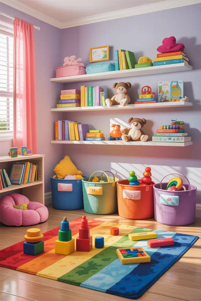 Use baskets, drawers, or toy boxes to keep the room tidy. Easy storage helps kids learn organization while keeping playtime stress-free.