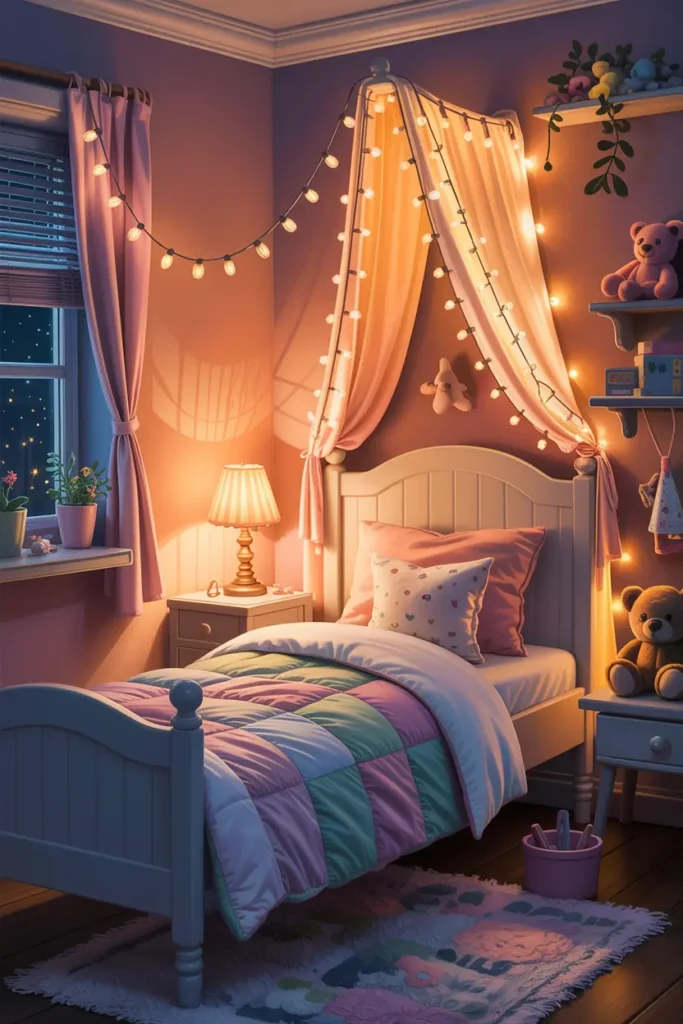 Use warm night lamps or fairy lights instead of harsh ceiling lights. Soft lighting helps kids feel relaxed and safe at night.