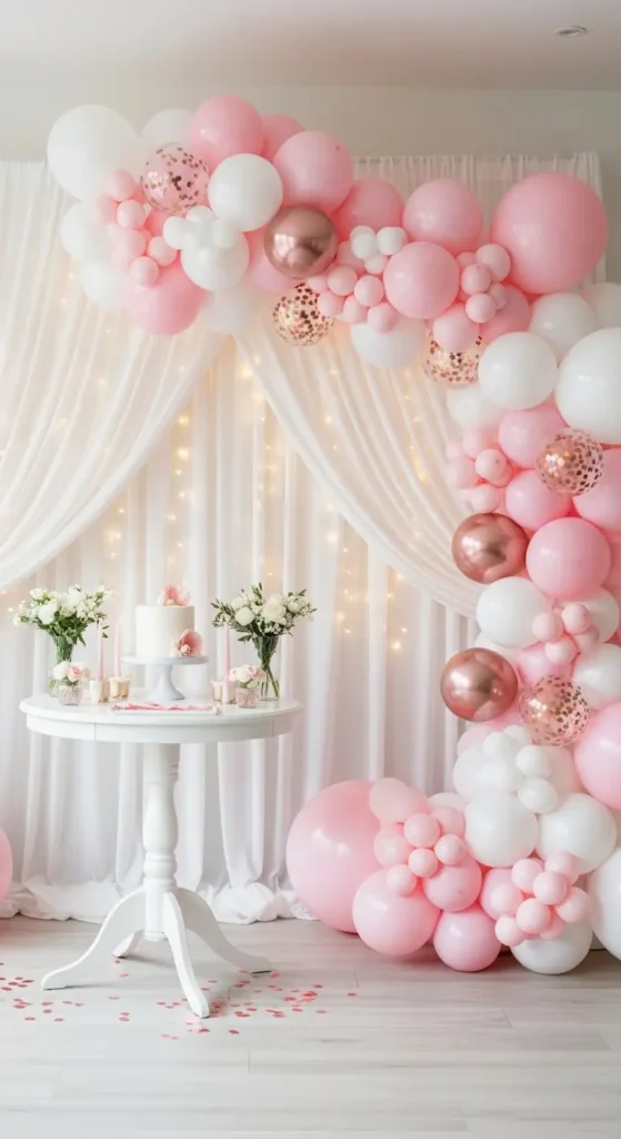 A pastel balloon arch instantly becomes the highlight of the party. Mixing blush, peach, and soft white balloons creates a gentle and modern look.