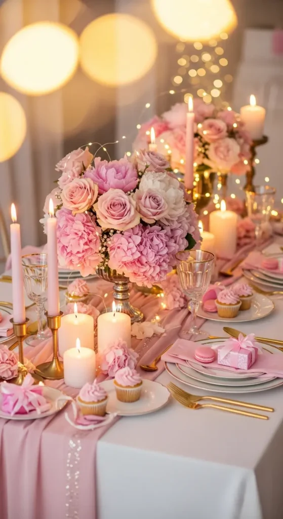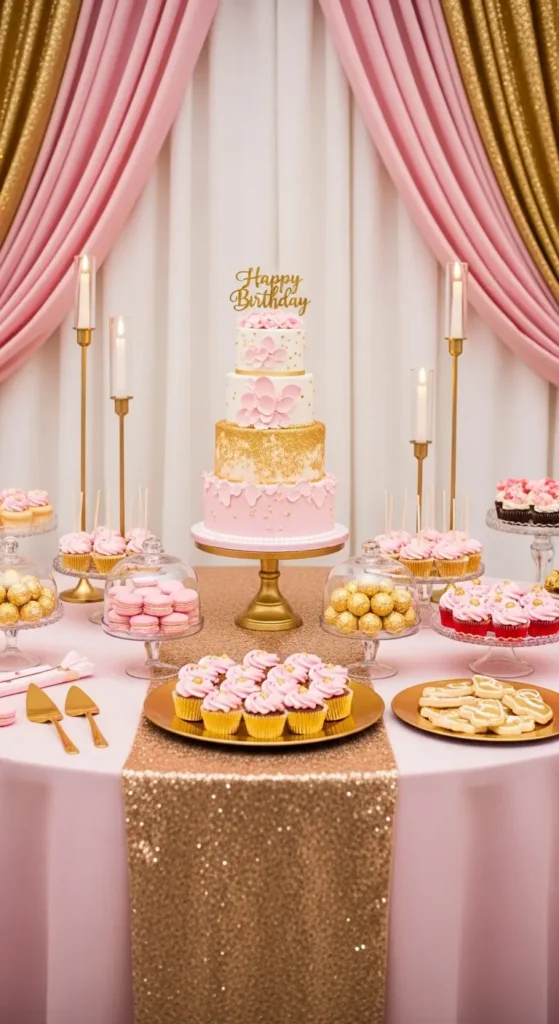 Pink paired with gold accents adds a touch of luxury. Use gold cake stands, pink tablecloths, and matching decorations for a balanced setup.