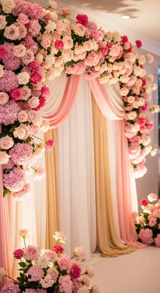Artificial or fresh flowers combined with pink fabric backdrops create a dreamy environment perfect for photos.