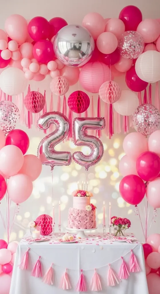 Floating pink balloons with ribbons hanging from the ceiling create a magical look, especially for indoor parties.
