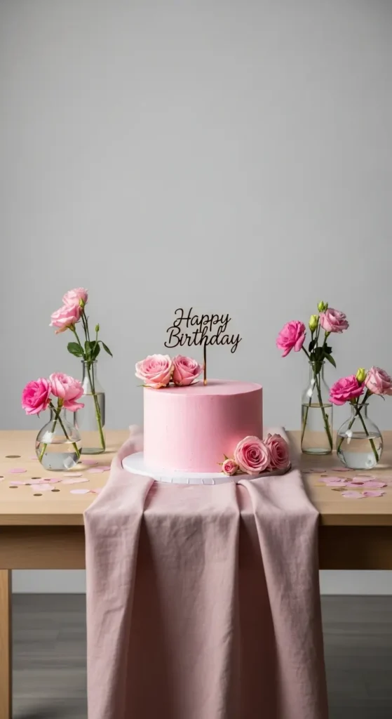 Sometimes less is more. A simple pink cake, neutral background, and a few balloons can look incredibly stylish.