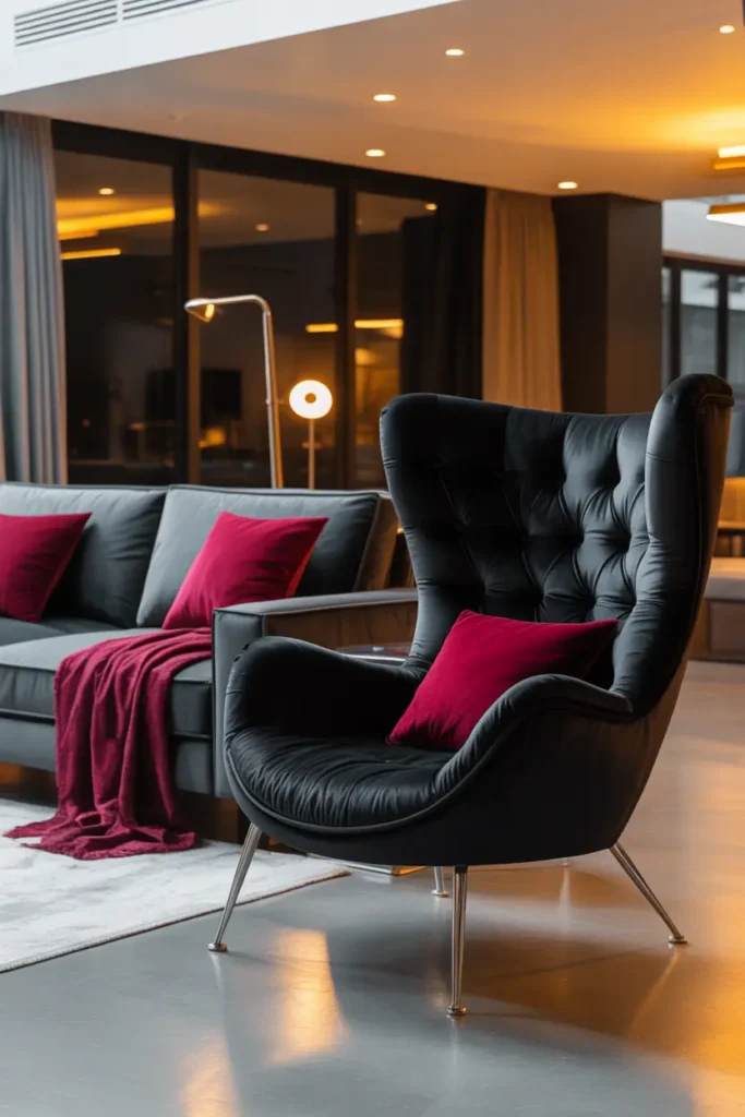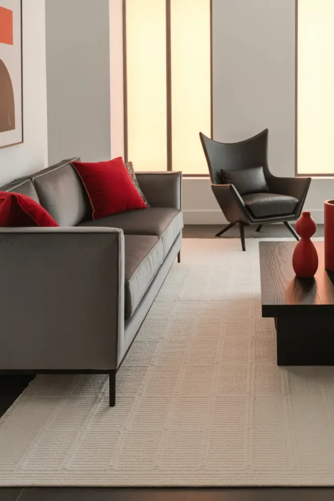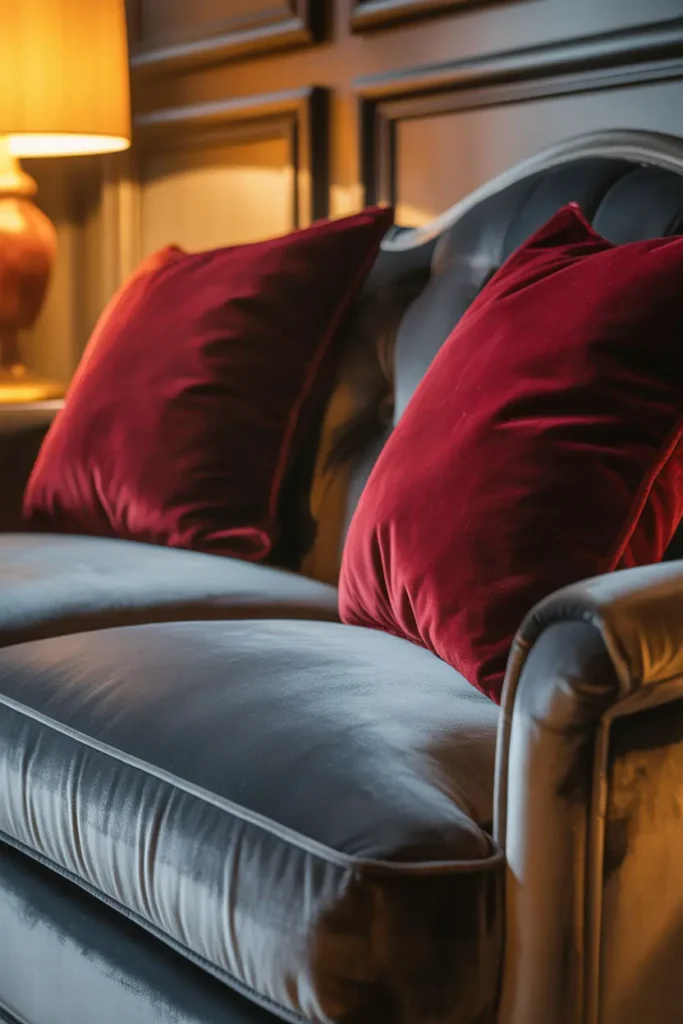 There’s a certain richness that comes from combining gray, red, and black especially when velvet is involved. It’s a palette that feels confident and dramatic, yet when styled carefully, it can also feel deeply cozy and inviting. In 2026, designers are leaning into this contrast: bold color + soft texture + balanced lighting.