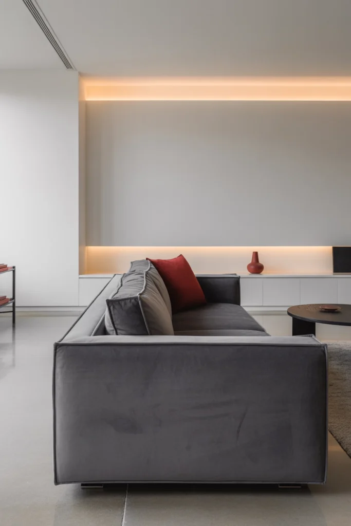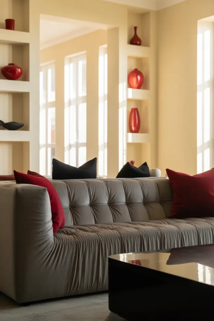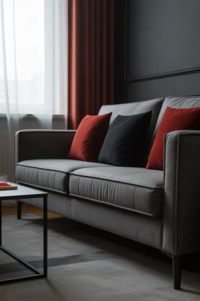 A gray velvet sofa is the perfect starting point because it grounds the entire room without feeling too heavy. Its soft texture naturally adds comfort, while the neutral tone allows stronger colors like red and black to stand out without clashing. Placing it at the center of your living room creates a base that feels balanced and easy to build around.