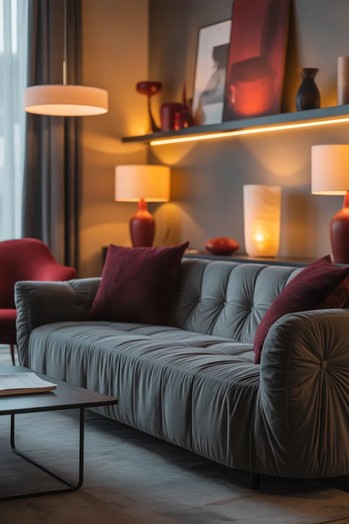 Gray, red, and black velvet may seem bold at first, but when styled thoughtfully, they create a living room that feels both dramatic and cozy. The softness of velvet balances the intensity of the colors, while smart lighting and layout choices keep the space inviting.