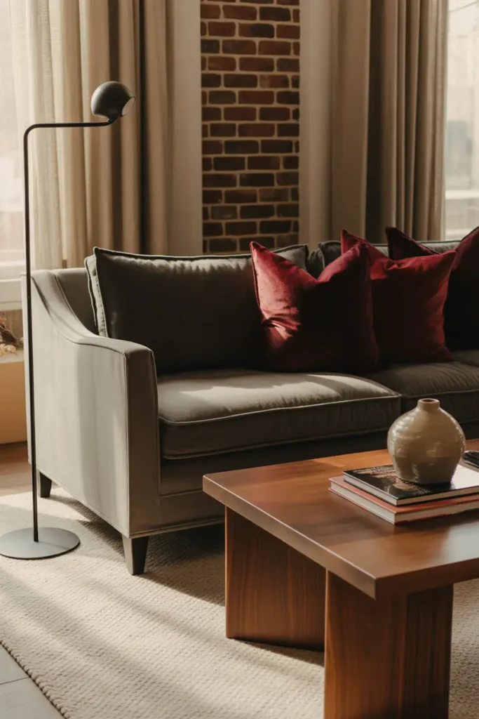 Red is what gives this palette its warmth and personality. Using deep red velvet cushions on a gray sofa introduces color in a soft and controlled way. The velvet texture keeps the red from feeling too sharp, turning it into something rich and inviting instead.
