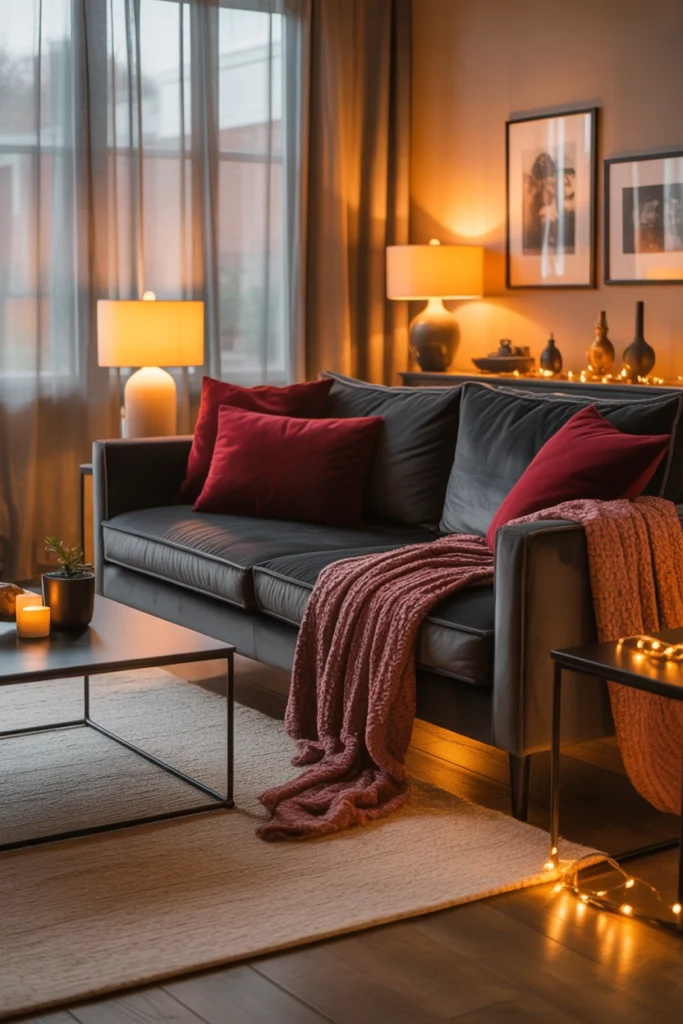Gray, red, and black velvet may seem bold at first, but when styled thoughtfully, they create a living room that feels both dramatic and cozy. The softness of velvet balances the intensity of the colors, while smart lighting and layout choices keep the space inviting.