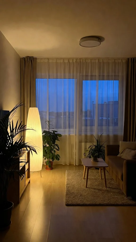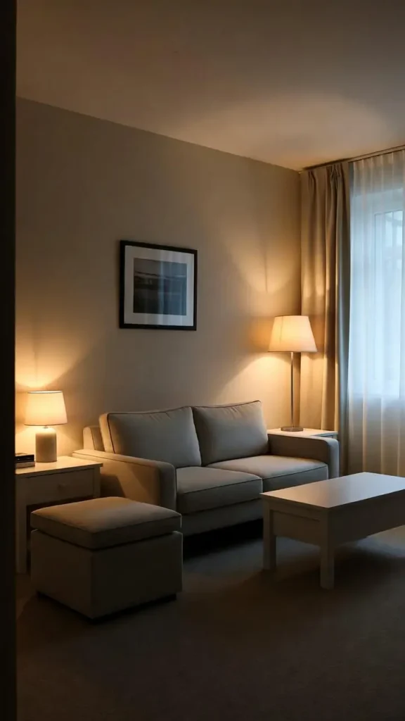 Changing lighting has a huge impact. Floor lamps, warm LED bulbs, or string lights can create a relaxing mood at a low cost.