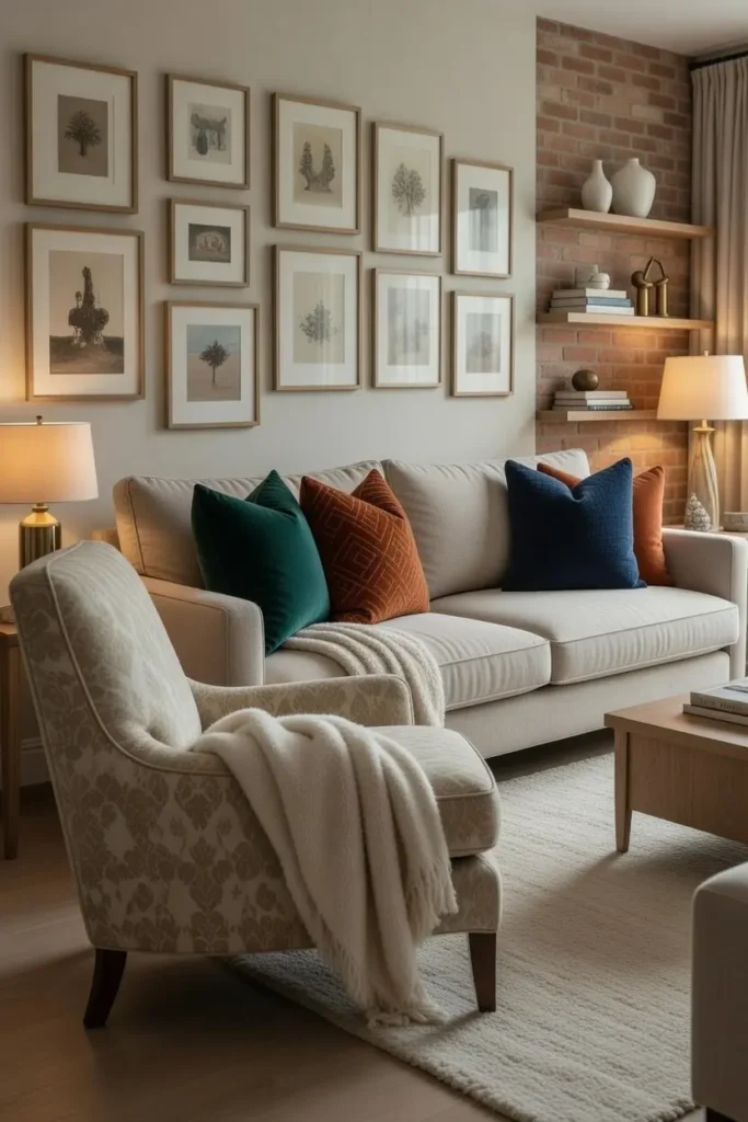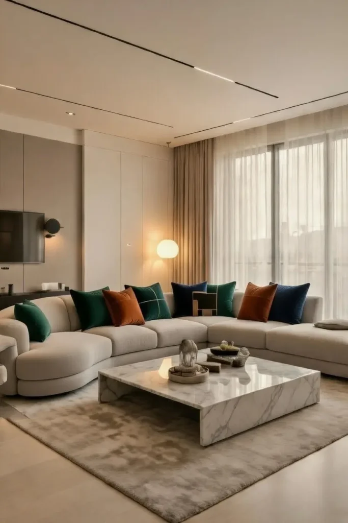Personality comes from contrast. Add one or two accent colors through cushions, artwork, or decorative accessories. Deep green, rust, navy blue, or muted mustard shades work beautifully in modern spaces.
