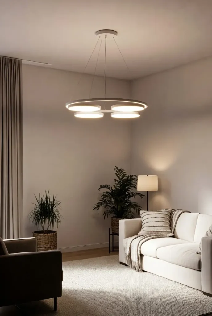 Lighting can act as artwork in a contemporary living room. Sculptural pendant lights or modern floor lamps create a strong visual focus while improving ambiance.