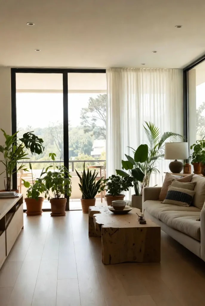 Indoor plants, wooden textures, and natural materials soften modern interiors and make them feel more welcoming.