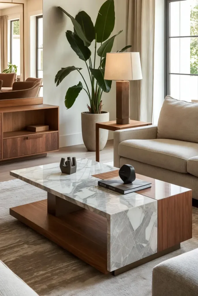 Combine glass, metal, wood, or marble finishes to create a layered contemporary style. A mixed-material coffee table is an easy way to add sophistication.