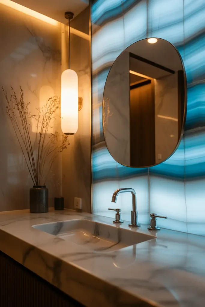 A blue onyx accent wall instantly transforms a bathroom into a calm and luxurious retreat. The natural patterns inside the stone look like flowing water, creating a soothing visual effect. When paired with soft lighting, the surface reflects gentle shades of blue that make the space feel peaceful and elegant. This style works beautifully behind a bathtub or vanity area.