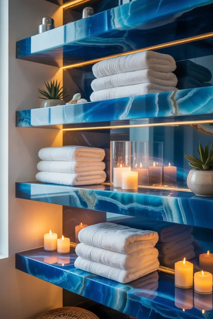 Blue onyx shelf panels add subtle luxury without overwhelming the space. The stone brings color and texture while still keeping the bathroom light and peaceful. When paired with candles and soft towels, the shelves feel warm and inviting.