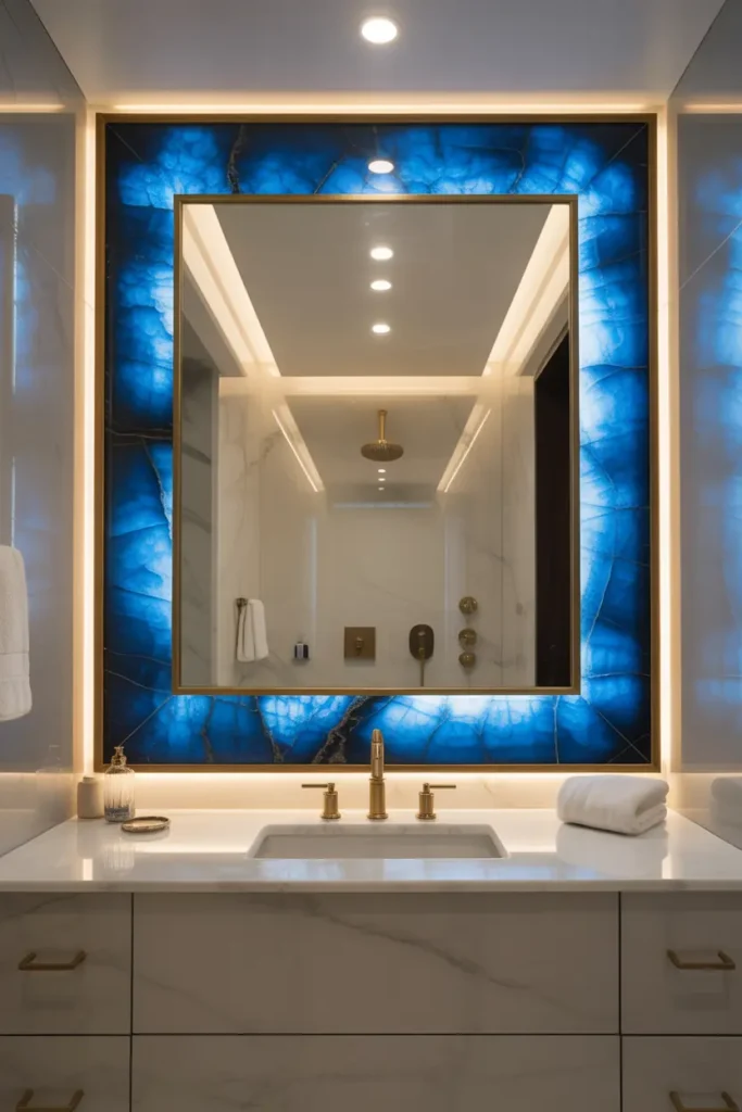 A blue onyx mirror frame adds personality and artistic beauty to your bathroom. The stone creates a soft border that feels elegant and unique. It instantly makes the vanity area look more refined and luxurious.