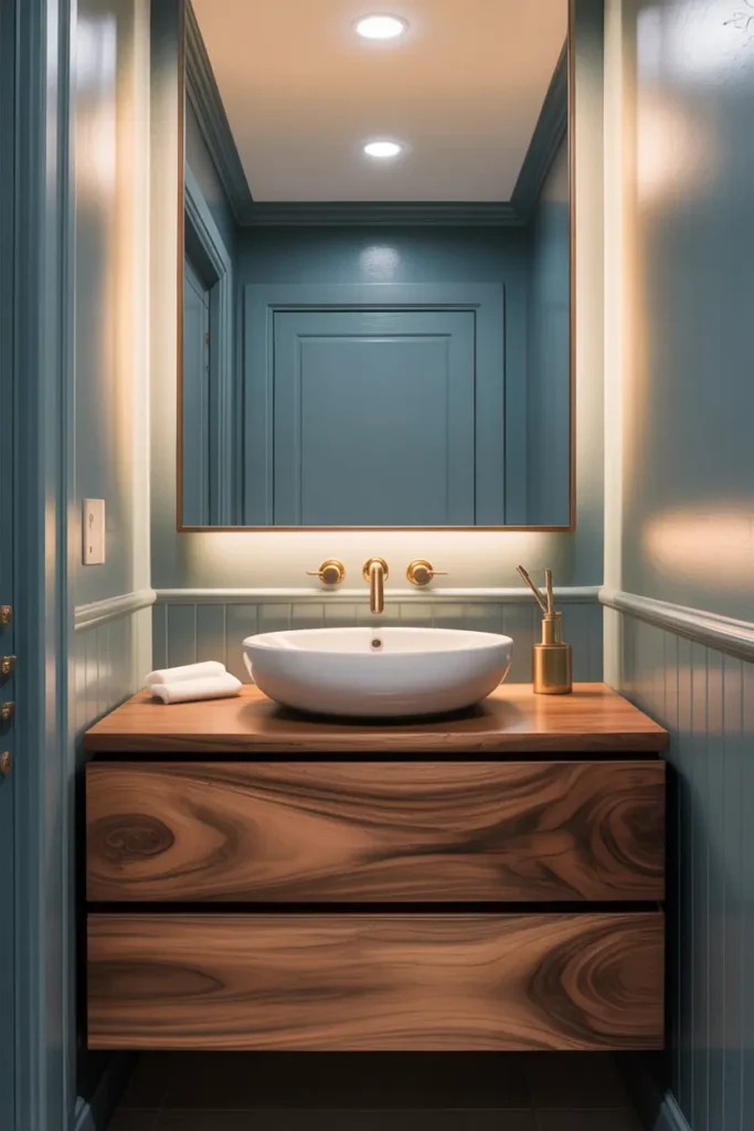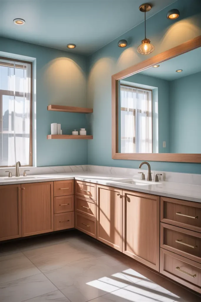 Blue walls instantly bring calm and freshness into a bathroom, while brown wood adds warmth and grounding beauty. This color combination creates a perfect balance between cool and cozy. The soft blue makes the room feel clean and peaceful, while the wooden vanity brings natural charm. Together, they create a space that feels stylish yet emotionally comforting.