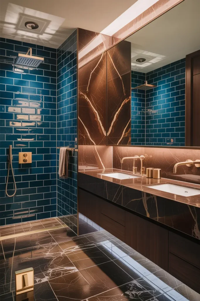 Blue tiles paired with brown marble create a rich and elegant bathroom design. The glossy blue surface reflects light beautifully, while brown marble adds depth and natural texture. This combination feels luxurious without being overwhelming. It creates a spa-like environment that feels calm and refined.