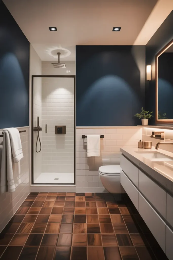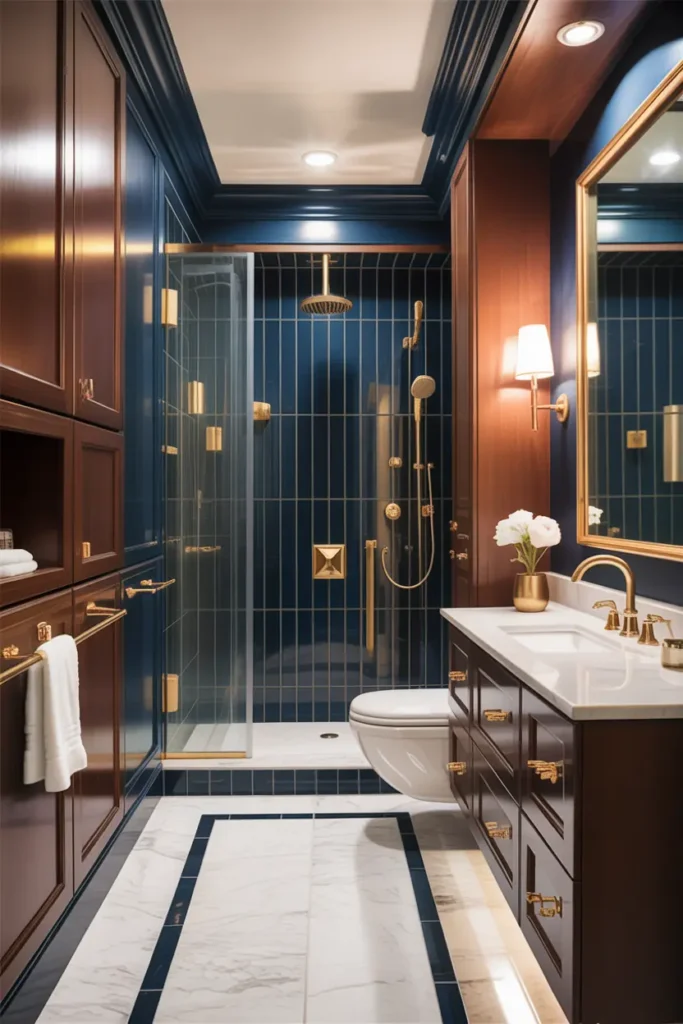 Navy blue brings depth and drama, while chocolate brown softens the look with warmth. Together, they create a bold yet comforting bathroom atmosphere. The dark blue feels elegant and calm, while brown adds a rich, cozy contrast that keeps the space emotionally balanced.