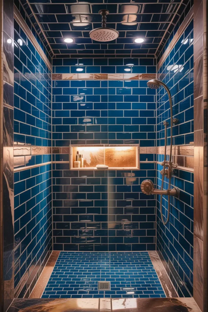 A blue shower wall feels refreshing, while brown stone accents bring natural warmth. Together, they create a spa-like atmosphere that feels peaceful and elegant. The water reflections on blue tiles make the space feel clean and calming.