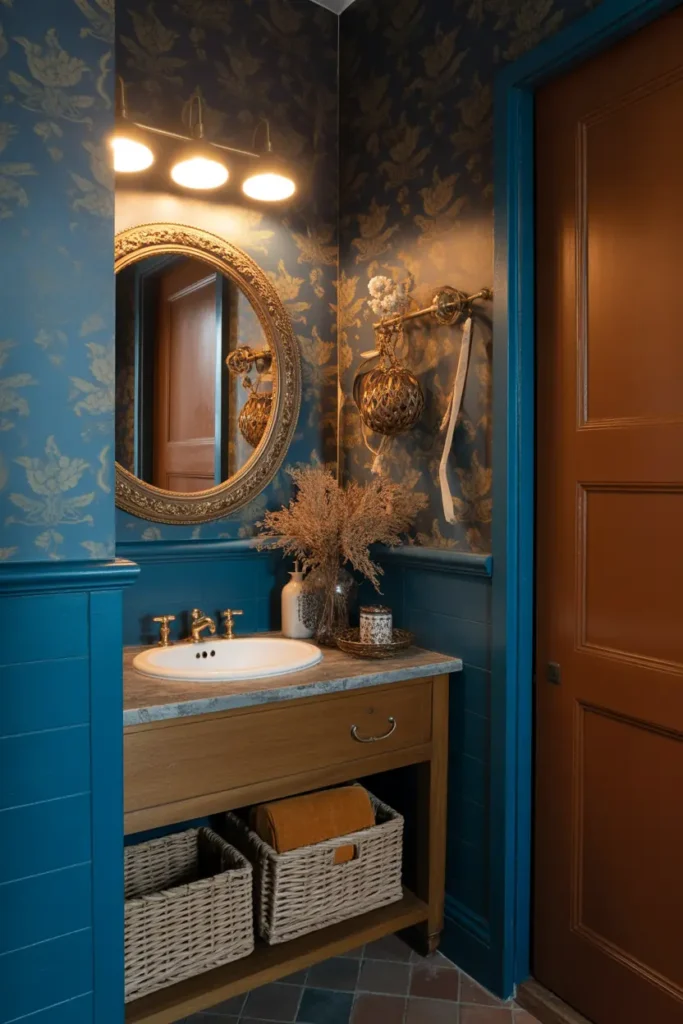 Blue wallpaper adds personality, while brown décor keeps the space warm and grounded. The patterns bring movement, while the brown tones add emotional comfort. This combination feels artistic yet peaceful.