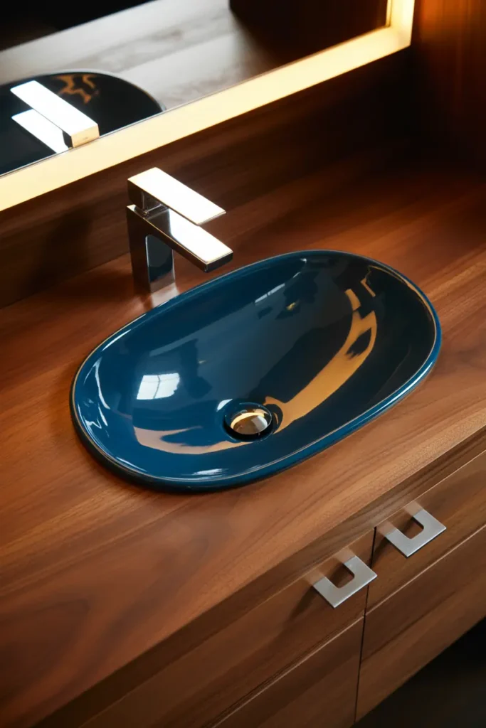 A blue sink basin feels artistic and unique, while a brown vanity adds warmth and structure. This contrast makes the sink stand out beautifully. The design feels modern, creative, and stylish.