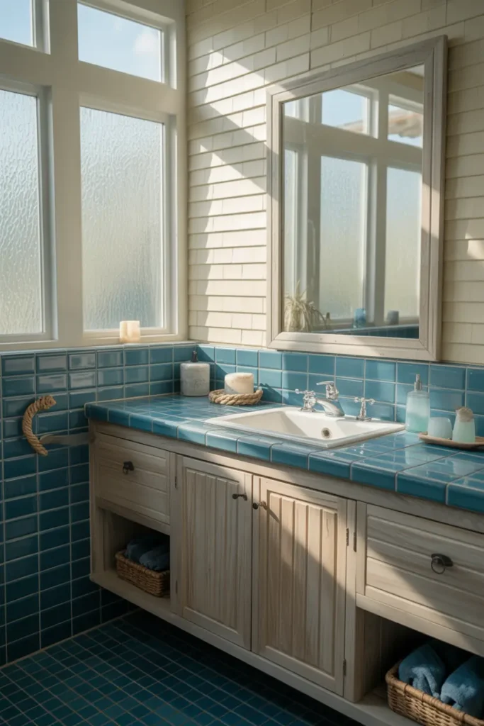 Add woven baskets and soft towels to complete the look. The bathroom becomes fresh, airy, and emotionally soothing.