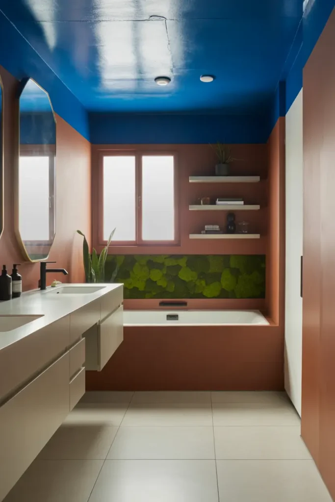 Use soft lighting to blend the colors smoothly. The result is a bold yet peaceful bathroom design that feels unique and modern.