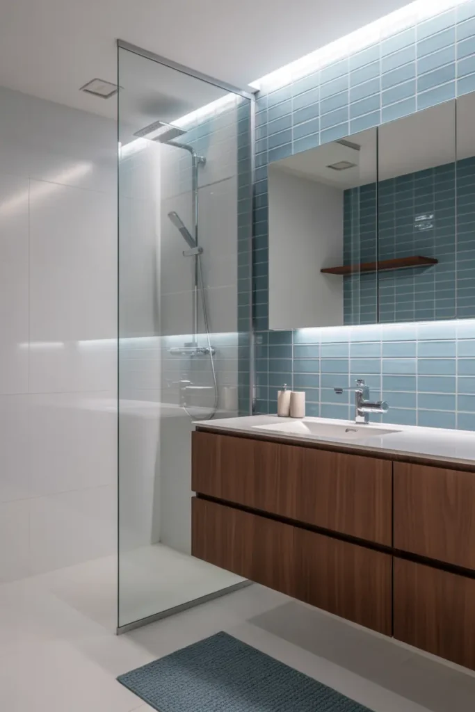To enhance this look, keep décor simple with white towels and minimal accessories. Add warm lighting to soften the blue tones and highlight the wood texture. The result is a bathroom that feels balanced, welcoming, and perfect for everyday relaxation.
