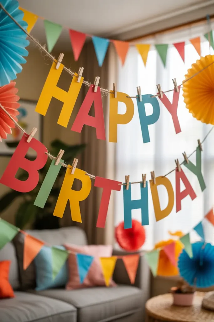 A handmade birthday banner instantly adds charm to the party. You can create one using colored paper, cardboard letters, or printed designs.