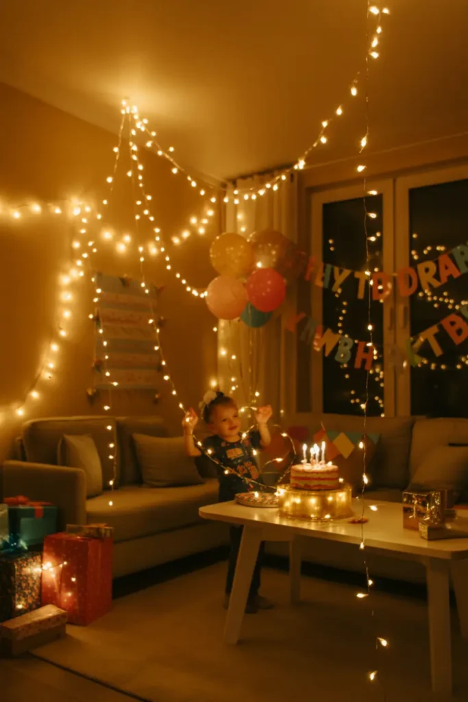 Fairy lights can completely transform the atmosphere of a room. Their warm glow makes the space feel cozy and magical, especially during evening celebrations.