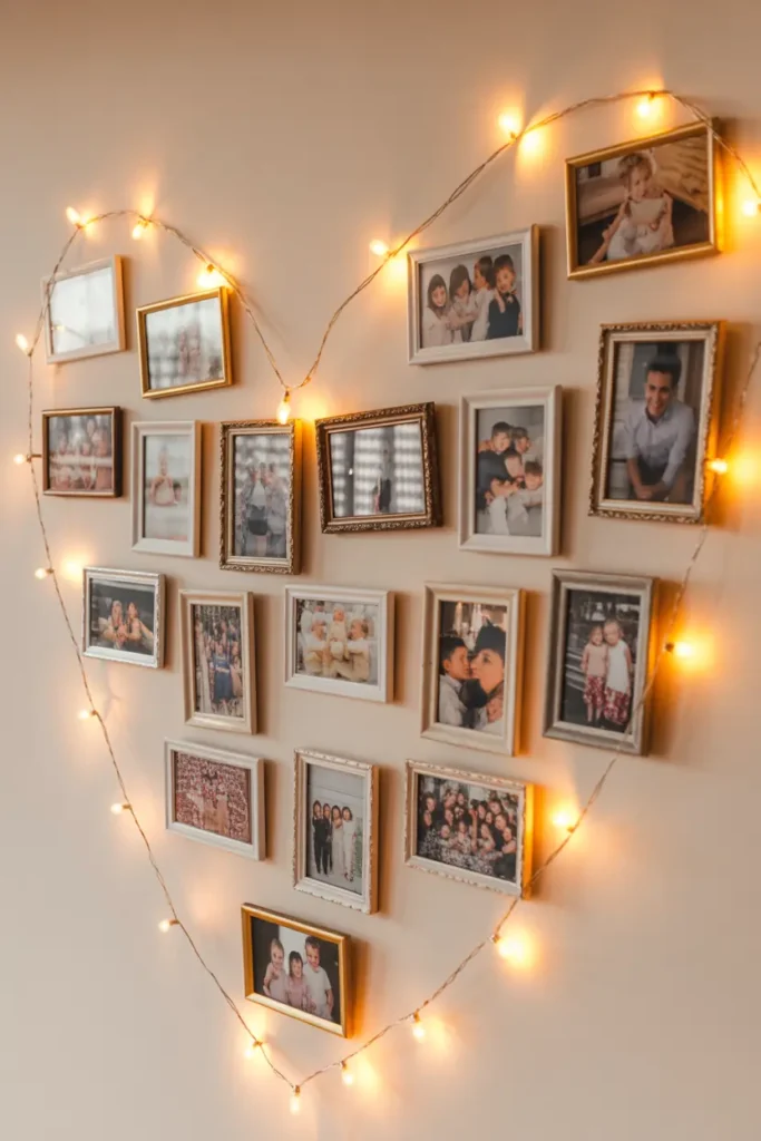A photo memory wall is a beautiful way to celebrate memories. Print photos of special moments and attach them to a wall using clips or string lights.