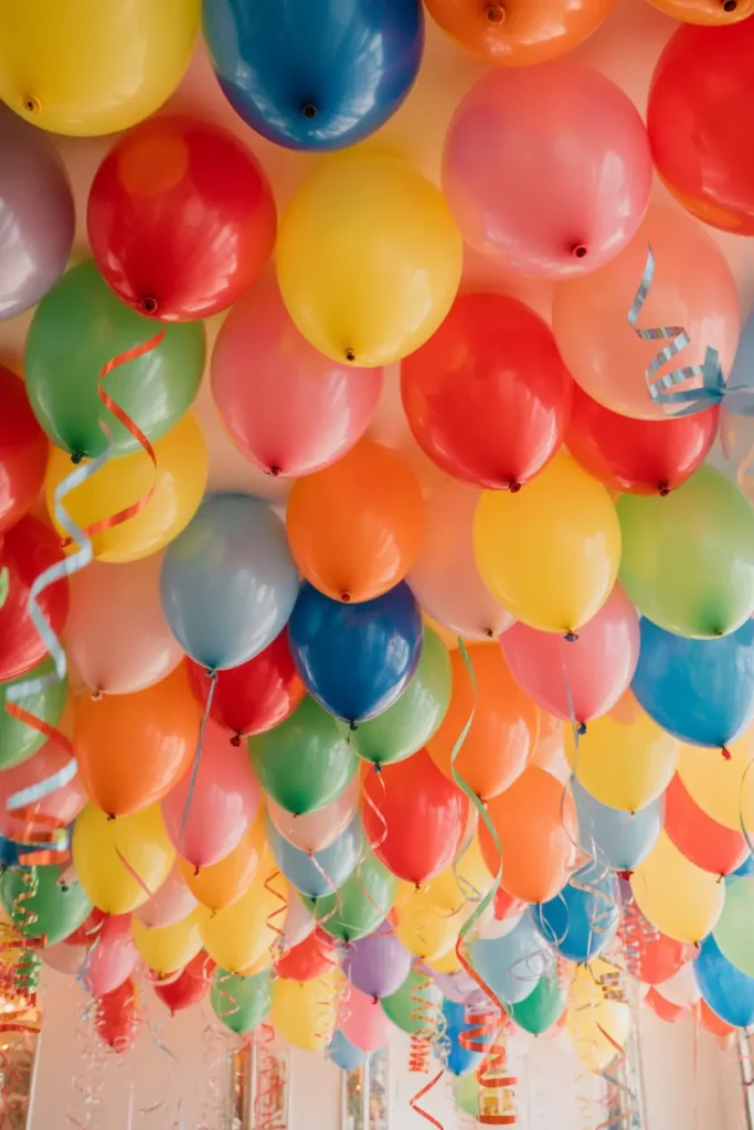 Instead of placing balloons only on the floor, decorate the ceiling with balloons and ribbons hanging down.