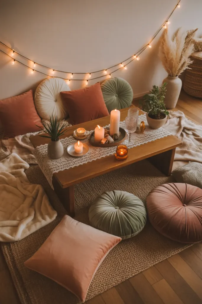 For a cozy celebration, try an indoor picnic arrangement with floor cushions, a small table, and soft lighting.