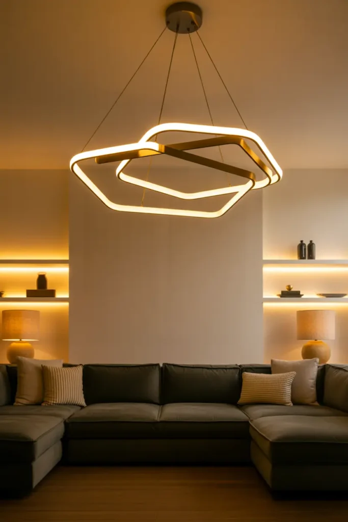 A stylish pendant light or chandelier can act as the centerpiece of the room, while floor lamps and table lamps provide softer lighting for relaxation. This layered lighting approach makes the space feel warmer and more inviting, especially in the evening.