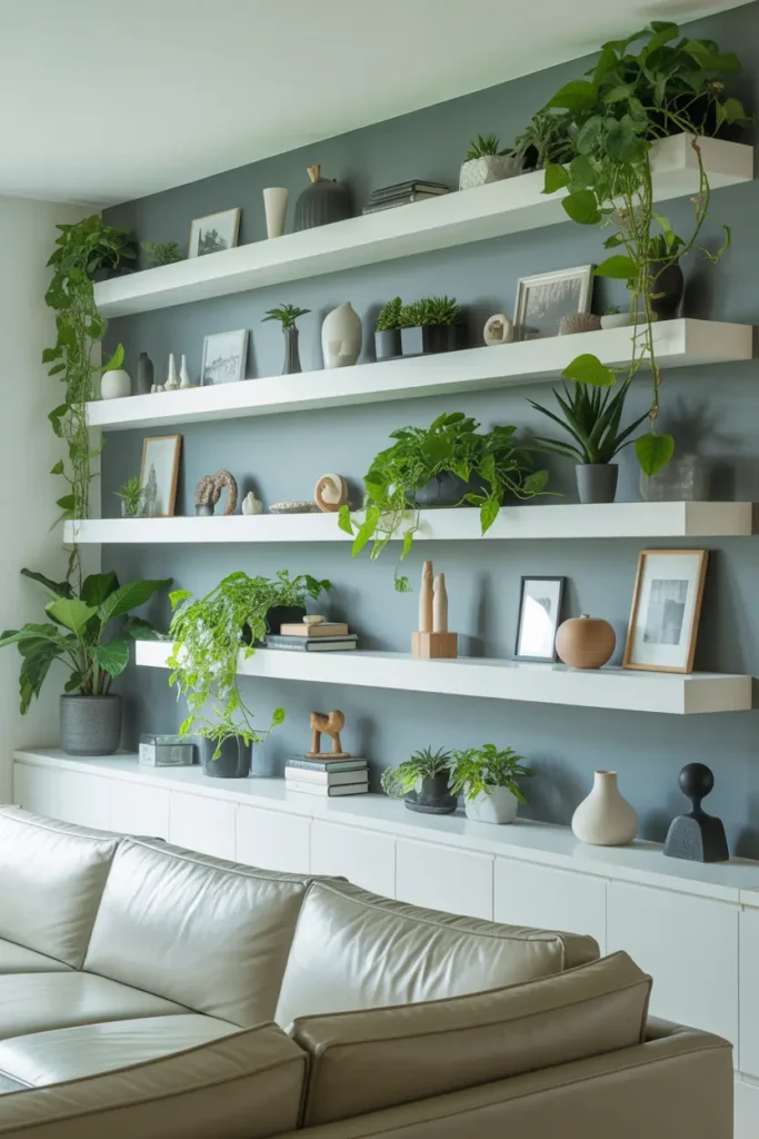 8. Install Floating Shelves to Display Decorative Living Room Items