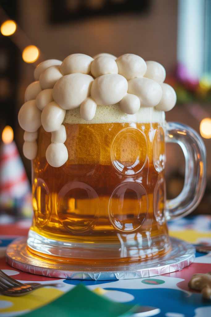 A beer mug cake is a popular novelty cake design. It can be shaped like a frothy beer mug using caramel-colored frosting and white foam-like icing.