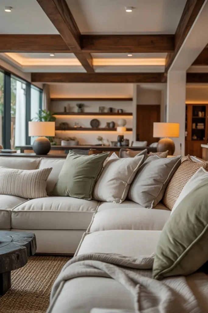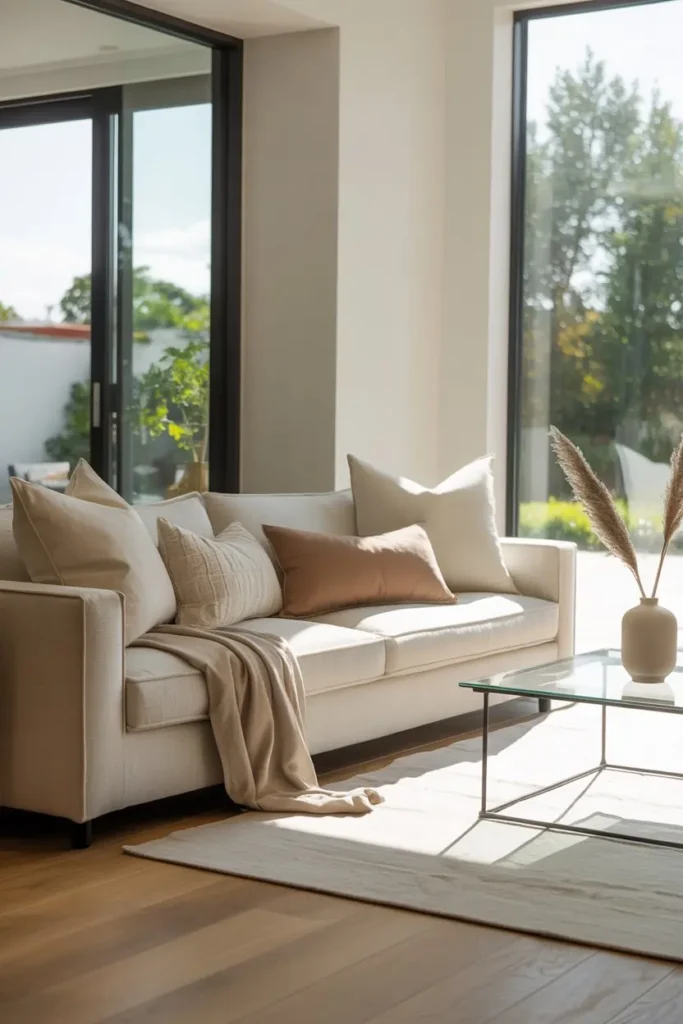 Modern interiors sometimes risk feeling cold. Soft layers like throws, cushions, and rugs add warmth and make the room feel lived-in.