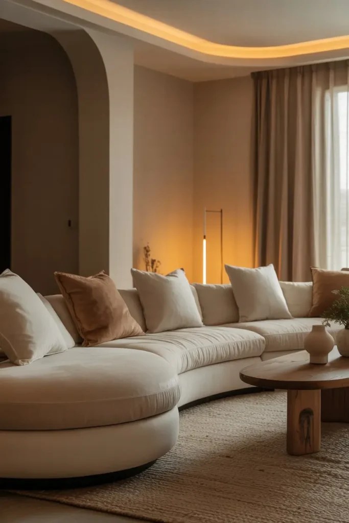 Modern contemporary furniture often features clean lines with soft curves. Curved sofas, rounded coffee tables, and organic shapes create visual softness and prevent the room from feeling too rigid.
